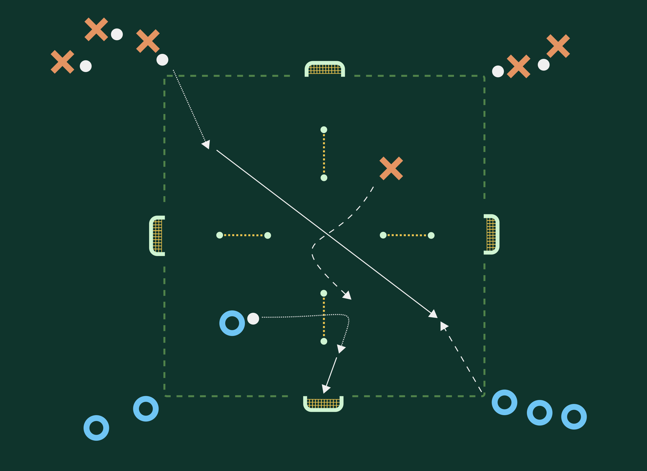 Spieler X eröffnet das 1v1 per Zuspiel auf Spieler O, welcher zunächst eines der 4 Dribbeltore durchlaufen muss und dann auf eins der 4 Minitore abschließen kann.