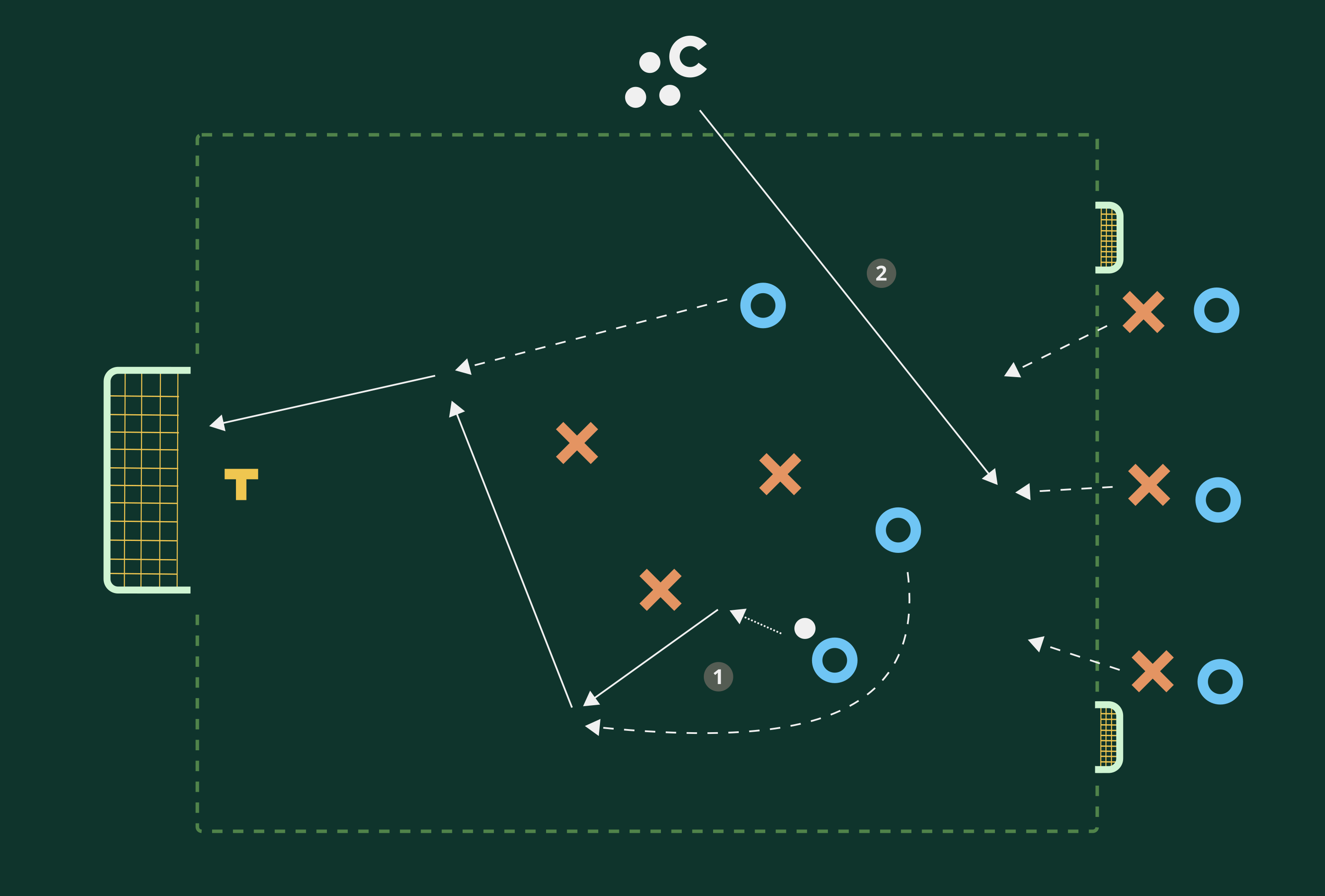 Team O versucht, ein Tor zu erzielen. Team X versucht, den Ball zu erobern und auf die Minitore zu kontern. Sie dürfen dabei die Überzahl mit dem Torhüter T ausspielen, falls nötig. Ist die Aktion abgeschlossen (Tor, Ausball, ..), wird Team O zu Verteidigern und Team X verlässt das Feld. Das nächste Team X startet als Angreifer nach Zuspiel des Trainers.