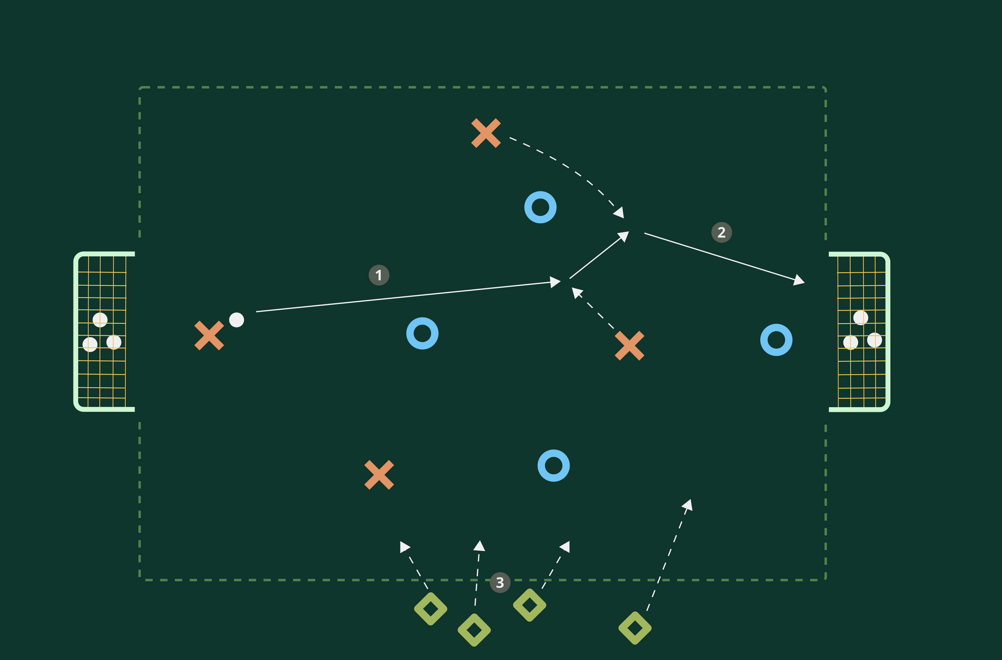 3 Teams einteilen. Genügend Bälle in den Toren platzieren bereitlegen.